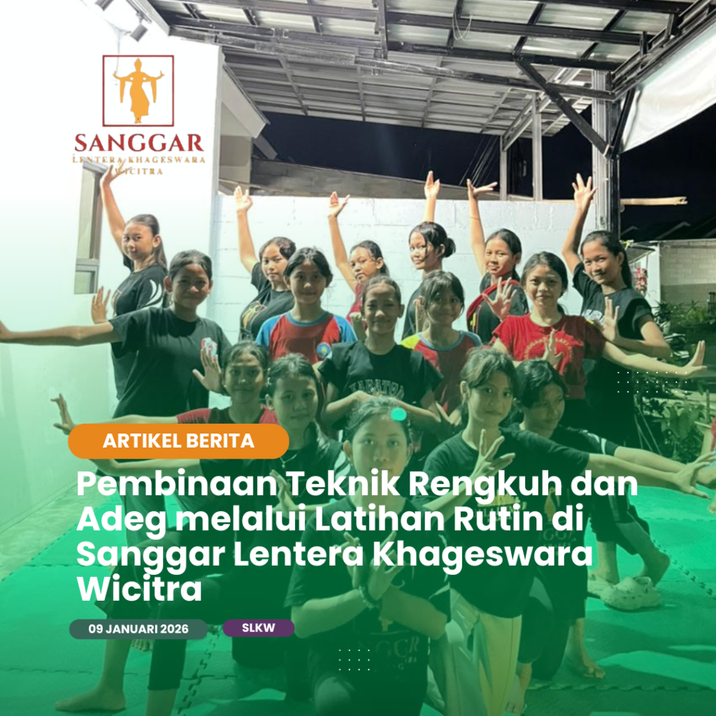 Pembinaan Teknik Rengkuh dan Adeg melalui Latihan Rutin di Sanggar Lentera Khageswara Wicitra Sanggar Lentera Khageswara Wicitra secara konsisten melaksanakan latihan rutin sebagai bagian dari pembinaan teknik dasar penari, khususnya pada penguasaan rengkuh dan adeg. Kedua unsur tersebut merupakan bagian penting dalam tari tradisi yang berfungsi sebagai dasar sikap tubuh, keseimbangan, serta keindahan gerak dalam […]